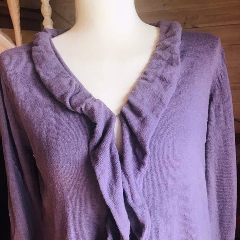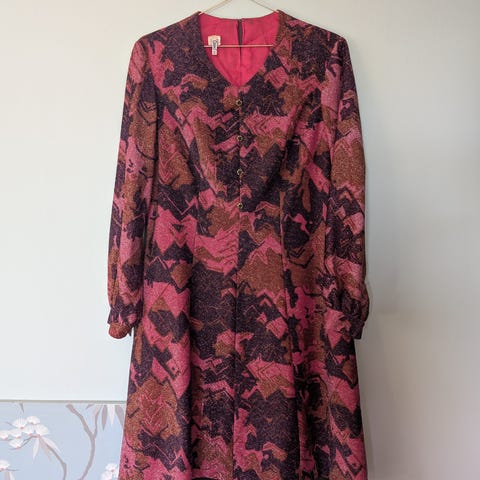 Strikk i livet. Uten lommer. Skråsplitt under deler av frynsekanten. Skjørtet er 90 cm langt. Lar ellers bildene tale for seg. I god stand. Se også tilhørende jakke og bukse i mine andre annonser, men legg merke til at de har andre størrelser.
