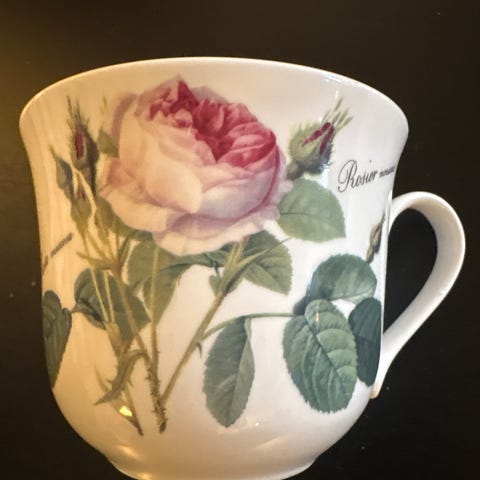 Vintage Roy Kirkham Redoute Roses fra 2006, store tekopper med skål, se stempel. Nydelig bone china, altså benporselen som gjør at koppen ikke "stjeler" varmen fra drikke og dermed kan man nyte kakao, te, uten at drikken kjølner raskt. Benporselen er de beste koppene å drikke av (min mening).