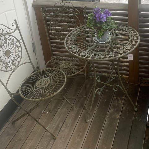 Har et veldig Spisielt rundt bord og 2 stoler I smijern..det er ikke støpegods...tunge og solide..med et mosaikk preg...målene kommer senere den andre stolen er der men ikke med på bildet....bordet er 60cm i diameter..og 72cm høyt.