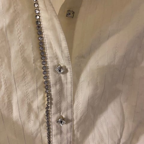 Festtopp i sateng med knyting som kan brukes både foran og bak. Har en nydelig smykkedetalj på brystet. Kjøpt på bruktbutikk.