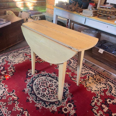 Selger et solid og sjarmerende gammelt klaffebord/slagbord i heltre med klaffer i begge ender og en skuff for oppbevaring. Bordet har over 100 års erfaring. Det har naturlige slitasjemerker som gir karakter.