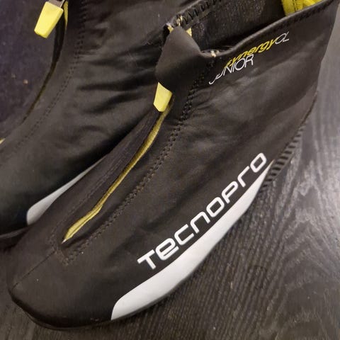Tecnopro Active langrennski i hvit og blå farge. Skiene har integrert binding, som på bildene er montert midt på skiene. Egner seg til klassisk langrenn på preparerte løyper. Materiale er typisk kompositt/kjerne med plast- og metallkomponenter i bindingene. Passer for brukere som ønsker et enkelt langrennsskioppsett til turbruk. Lengde og spenn er ikke oppgitt og bør kontrolleres mot høyde og vekt før bruk.