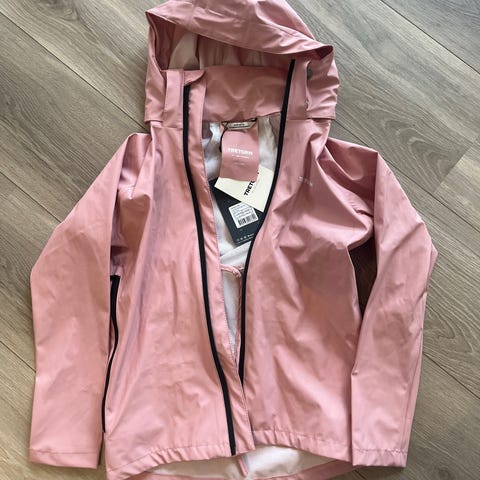 Tretorn regnjakke i størrelse 134/140 for jente. Jakken er gul og laget av polyester. Den har hette og trykknapper foran, samt lommer med klaff. Designet for å gi beskyttelse mot regn og fuktighet.