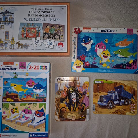 Selger puslespill med 2x12 brikker (Ravensburg) og asjett med kopp i baby shark motiv.