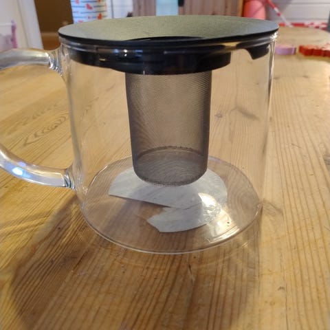 Tekanne i glass med sil. Silen kan tas ut og brukes separat i kopp. Tekannen er brukt kun én gang.