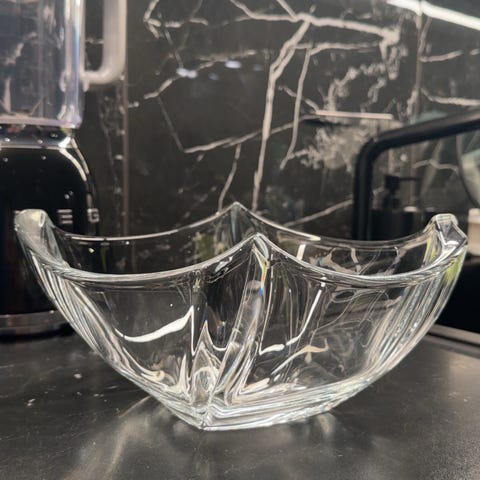 Retro Iitala glassbolle klart glass med teksturert design. Skålen har en rund form med solid fot og er egnet for servering.høyde 18 cm, diameter 19,5 cm. Fra 70 tallet.