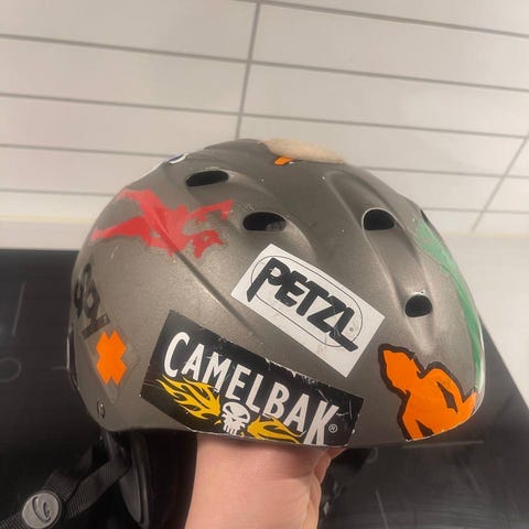 Selger en godt brukt, men ingen skader, en del bruksmerker hjelm, men gjør nytten sin. Størrelse 49-52 cm.