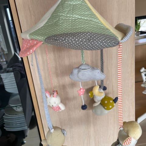IKEA barneleketøy med fargerike ballonger og hengende myke dyr. Passer til bruk som stimulering og underholdning for små barn/baby..