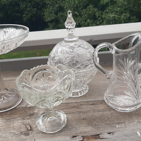 krystall punsjebolle med øse og seks kopper Kan brukes som vase, øsa som dekorasjon koppene til dessert f eks. pannacotta