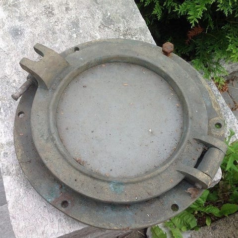 To hele komplette ko-øyer i fra en gammel båt, det er også en vinduskarm ring til innsiden av Ko-øyet, alt er i massivt messing, vinduene er hele. De blir helt strøkne når du får fjernet maling , selges alt samlet