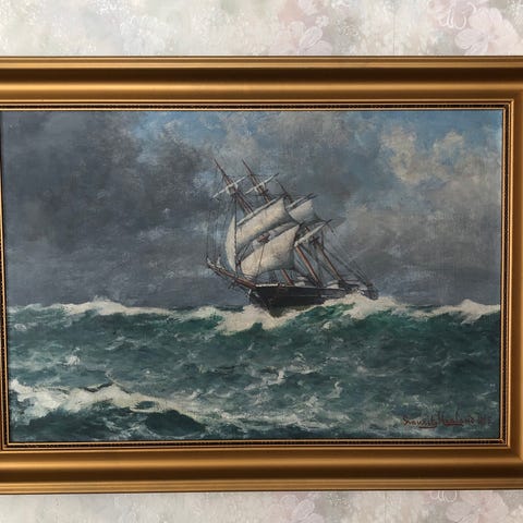 Maleri signert av Conrad Selmyhr 78 x51 cm. Motiv av seilskip på sjøen med fjell i bakgrunnen. Oljemaleri på lerret med ramme.