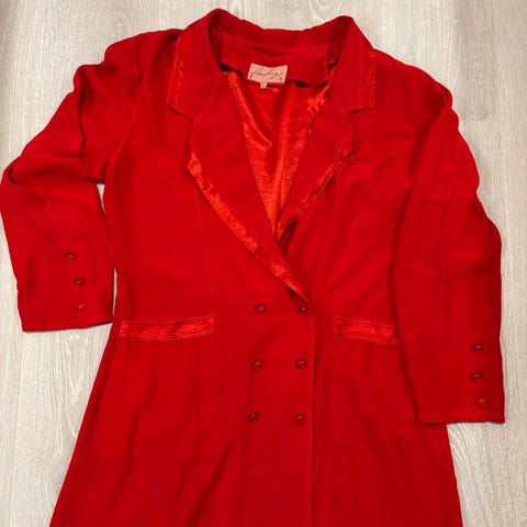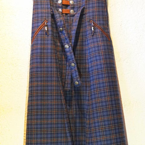 Åpnes med knapper ned til livet og en glidelås i siden. Skjørtet er fôret. Siden den er hjemmesydd vet jeg ikke størrelsen, men ca S. Livvidde 73 cm. Lengde fra livet (sømmen) og ned til skjørtekant er 70 cm.