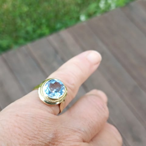 Gullring ustemplet med 9,4 mm kuleformet korall. Vekt 4,4 gr Taksert i 2019 til kr. 3.700,-.