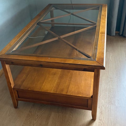 Bordet er brukt, og har noen bruksmerker – riper på toppen og et avskallet område på underhylla (se bilder). Dette kan enkelt dekkes med pynt eller males over. Ingenting som påvirker funksjon.
