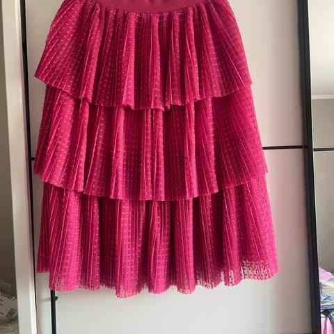 Langt knall rosa tyllskjørt. Merket str. L. Liten i størrelsen og som S/M. Elastisk strikk i livet. Midje måler ca. 70-110 cm. Lengde ca. 100 cm. Lengde underskjørt ca. 71 cm. Nederst langs skjørtekansten er det litt ujevn lengde der det er en søm. Det legges ikke merke til når skjørtet er på. Brukt en gang og fremstår som ny. Kjempefin Barbierosa farge ♥️