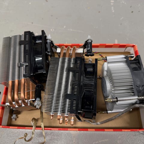 Dette er en LGA 2011 socket kjøler til PC med to vifter og radiator, brukt til nedkjøling av cpu.