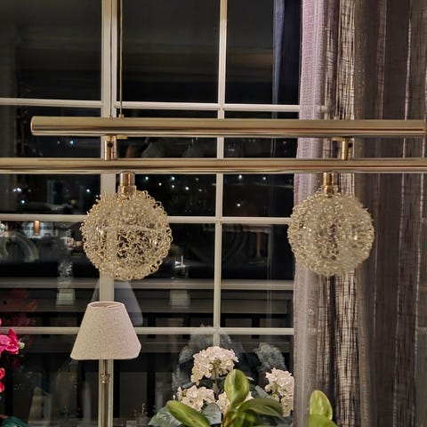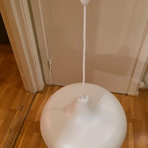 Diameter på lampen er ca. 50 cm, og høyden kan justeres med kabelen for å passe rommet.
