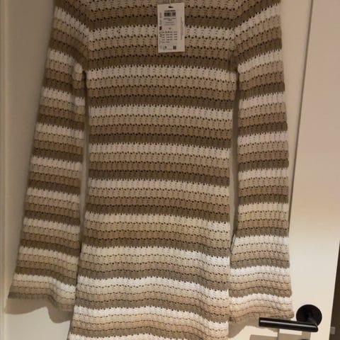 Dette er en nydelig og festlig kjole med heklet mønster i brun og blå. Materialet er jeg usikker på, men det ligner mest på bomull, men kan hende det er noe syntetisk i den også. Den har fine detaljer med festede knapper i metall, og det er en strikk som kan festes i midjen. Størrelse er XS/S. Den måler 115 cm i lengden. Merket er Superstar.
