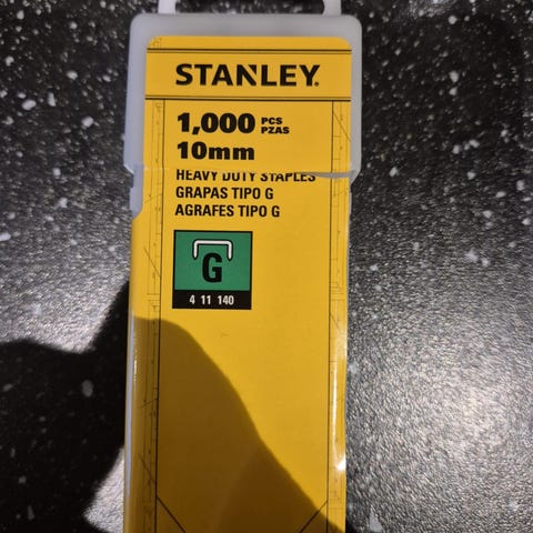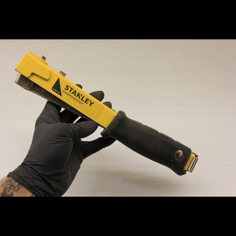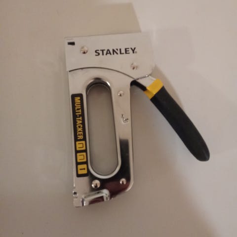 Stanley stiftemaskin med gult og svart håndtak. Verktøy for å feste materialer sammen med stifter.