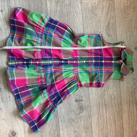 Selger en nydelig Ralph Lauren kjole i klassisk rutemønster. Kjolen har flere lag med volanger, søt sløyfe foran og glidelås bak. Perfekt til sommer, bursdag eller andre anledninger.