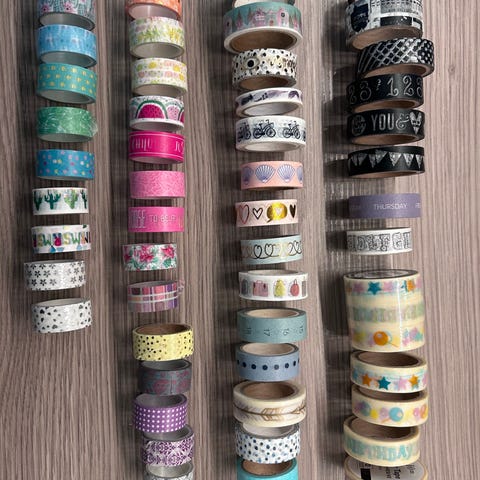 Selger en sett med 10 x ruller Washi-tape / papirtape i eske. Det var opprinnelig 12 ruller med tape i esken- (vennligst se igjennom bildene for detaljer). Obs! Rullene kommer med mindre tape enn en "vanlig" taperull.