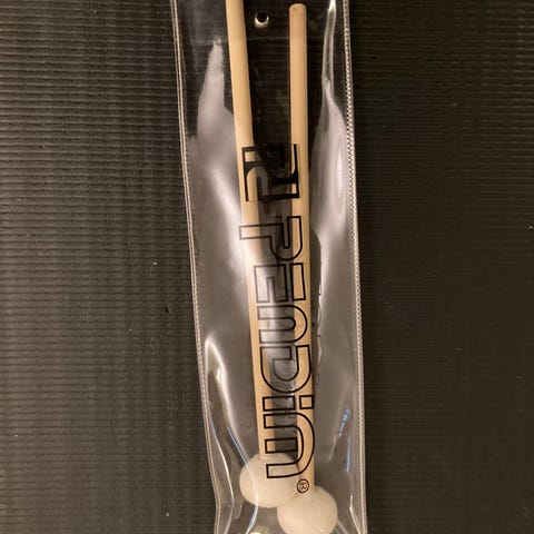 triangel med tilhørende trepinner. Triangelen er laget i metall med trepinner i tre. Egnet for musikalsk bruk og rytmeøvelser.