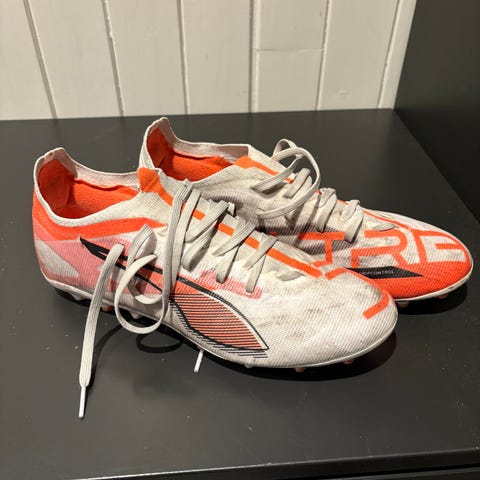 Puma Ultra fotballsko i størrelse 41. Skoene har en flerfarget overflate med hvit, rød og oransje nyanser. Designet for fotball med knotter på yttersålen for godt grep på banen.