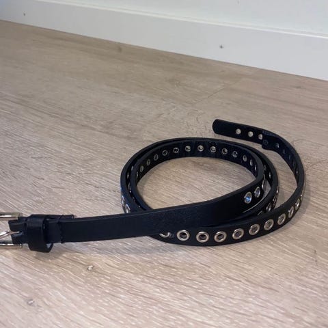Skinnbelte i svart med dekorativ metallspenne. Passer for unisex bruk.