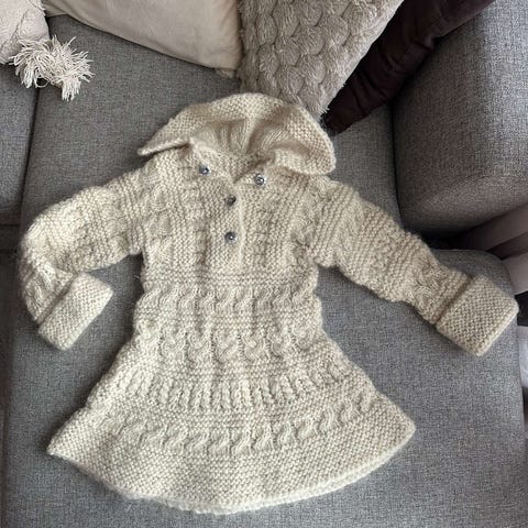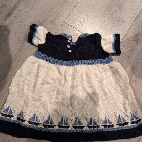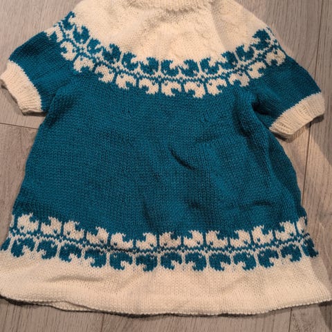 Hjemmestrikket ullkjole + sokker str. 2-3 år. Brystvidde 60 cm, armlengde 34, hel lengde 44 cm. Sokker i samme farger som kjolen.