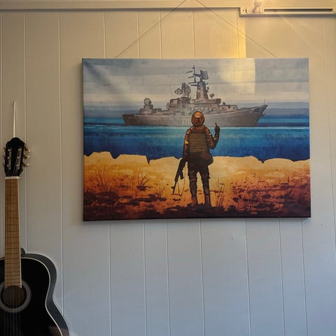 Stor ramme i gullfarget treverk med mørk grønn list.