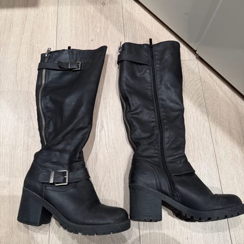 Mørk brune i imitert skinn, ca 42 cm i omkrets øverst i skaftet. Glidelås som kan åpnes både på innsiden og baksiden. Veldig gode å gå med.