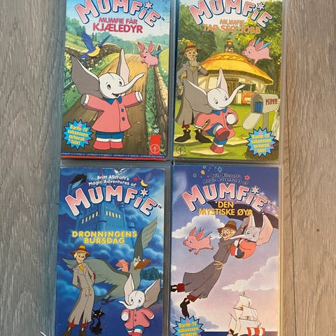 Pakke med to originale barnefilmer på VHS: «Mumfie – Magic Adventures of Mumfie» (ca. 2,5 timer spilletid) og «Bamse i Trollskogen», begge utgitt i Norge med norsk språk.