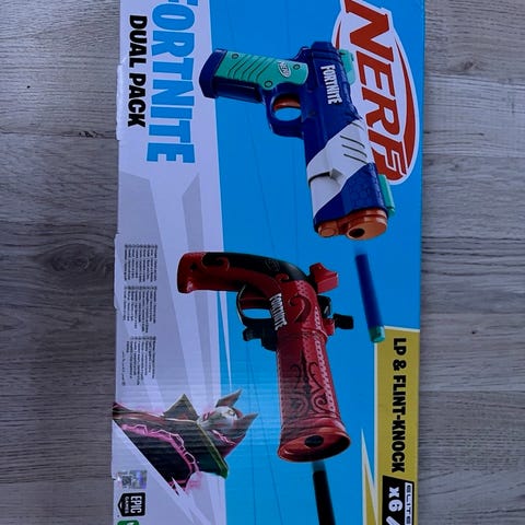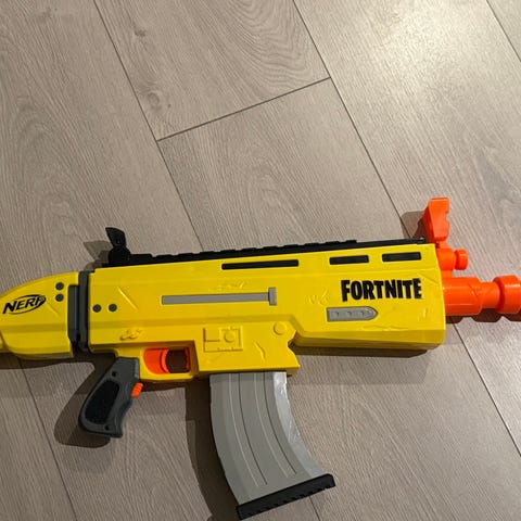 Fortnite lekepistol i gul og oransje farge. Laget av plastmateriale. Designet som en lekevåpenmodell, egnet for barn.