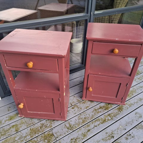 Treskap med fire skuffer, malt i rødt med blå kant. Laget av tre og egnet for oppbevaring av små gjenstander eller klær.