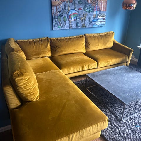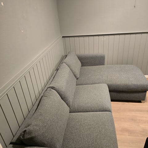 Nett og stram tre- seter med god plass til tre voksne. Sjeselongdelen er 140 x 65 cm og gir god hvile. Ullstoff i grønn/grå spettet farge som kan vaskes i maskin på ullprogram. God slitestyrke. Skum og dun i putene. Normal bruk og lite slitasje.