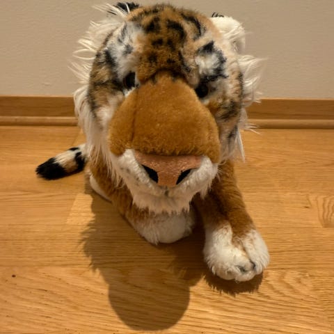 Tigeren lager lyder og beveger seg. Trenger store batterier. Pent og lite brukt, stått til pynt for det meste.