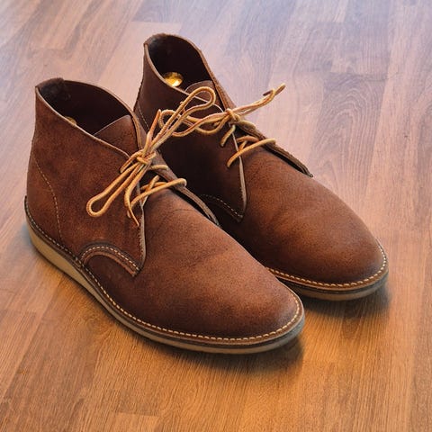 Klassiske boondockers laget av skomaker Kristian Lindtveit. Laget i Horween Calico roughout lær fra USA. Tunge laget av Horween Chromexcel i kontrastfarge. Double row stitchdown konstruksjon med Vibram 430 yttersåle. Jeg selger disse fordi de er bittelitt for små til meg. Brukt noen få kilometer, mest på kontoret. Uten synlige bruksmerker.