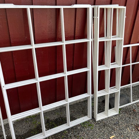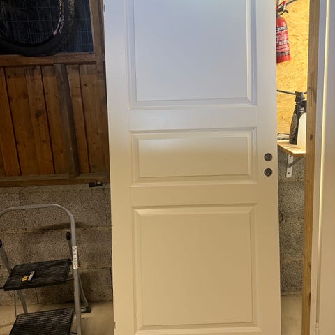 Selger et dørblad 82,5x204x4 cm som passer til karm 89x209 cm. Farge hvit bomull. Selges uten beslag og vridere med snap in hengsler. Noen små bruksmerker rundt håndtakene. Pris kr 400