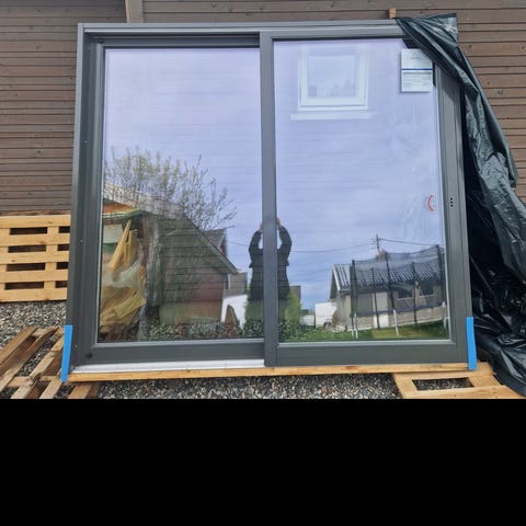 Ikke brukt – som ny. Skyvedører, trelags glasspakke, varmeisolerte dører. Sett utenfra åpnes de fra høyre mot venstre.
