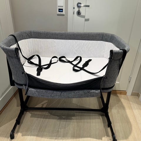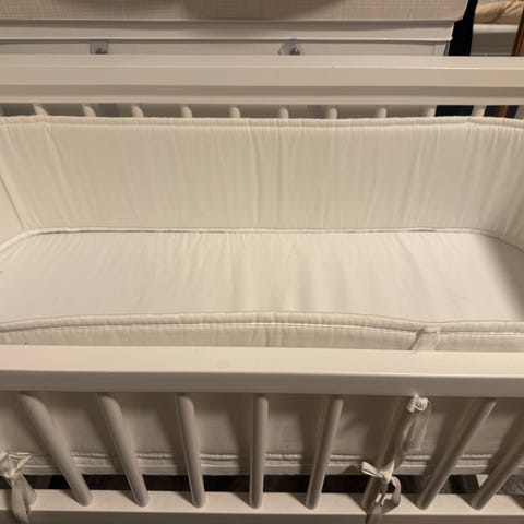 Stokke Bedside Crib i hvit og grønn farge. Designet for å festes ved siden av foreldreseng for enkel tilgang til barnet. Laget av solide materialer for sikkerhet og stabilitet.