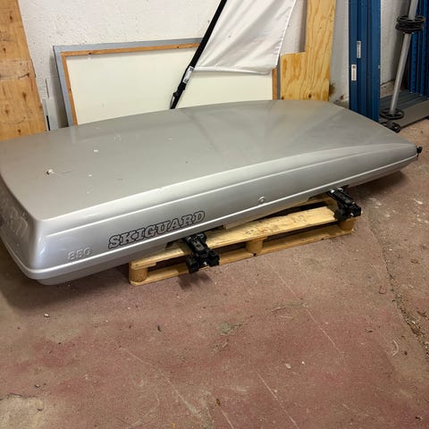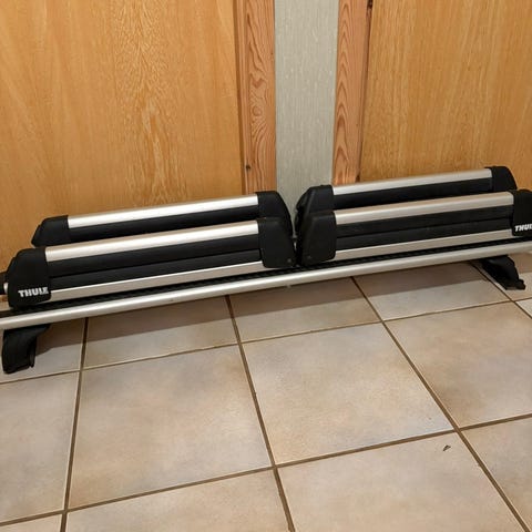 Thule ski- og snowboardholder i aluminium med låsbare låser. Designet for sikker transport av ski og snowboard på takstativ.