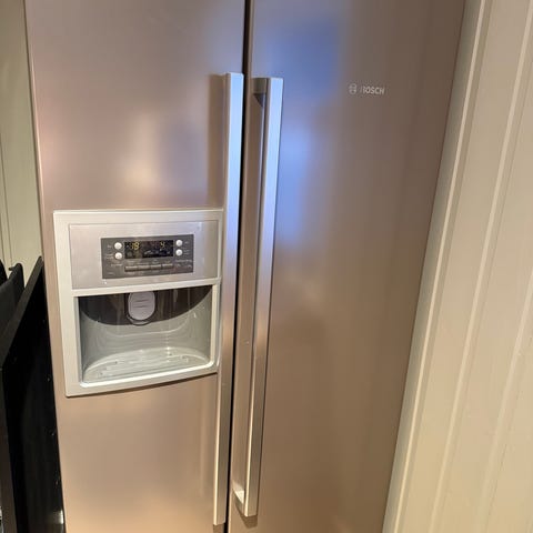 Hoover Side-by-Side kjøleskap med flere hyller og skuffer for oppbevaring. Kjøleskapet har et integrert vanndispenser på døren og separate rom for kjøling og frysing. Innredningen inkluderer justerbare glasshyller og oppbevaringsskuffer merket "Cool Space" for optimal temperaturkontroll.