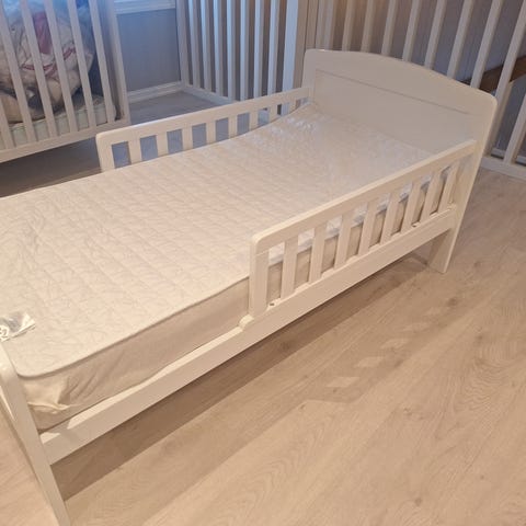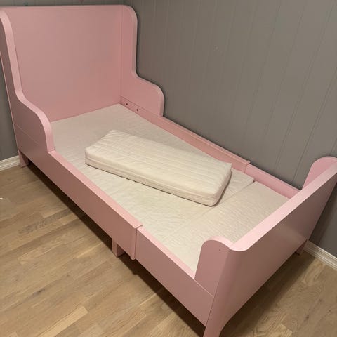 IKEA Juniorseng barneseng i rosa farge. Egnet for barn, og kan skyves ut i lengden etter som barnet vokser. Inkl madrass.
