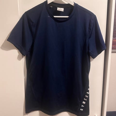 Gymshark T-skjorte i størrelse M, unisex. T-skjorten er grå med røde detaljer.