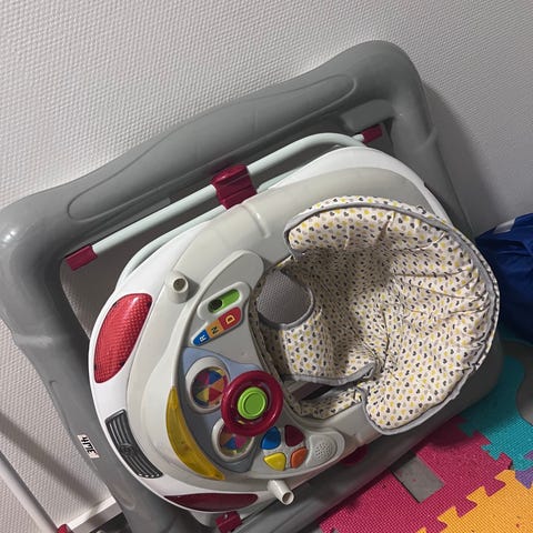 Barnetrille med fargerike aktivitetsdetaljer, designet for å støtte barnets tidlige gange og motoriske ferdigheter. Trillen har et håndtak for støtte og ulike knapper og hjul som stimulerer lek og læring.