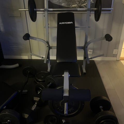 Selger en solid Kayoba treningsbenk med justerbar rygg, benkpress-stativ og mulighet for ben- og armtrening. Benken er lite brukt og i god stand.