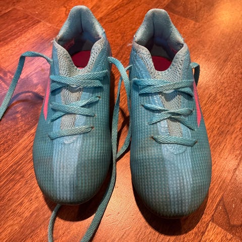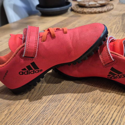 Adidas fotballsko til barn i blå farge, størrelse 32. For bruk på kunstgress eller gressbaner. Lite brukt.