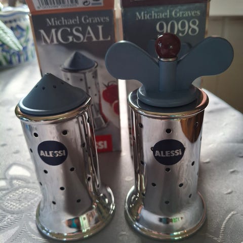 Selger et pent brukt salt og pepper kvernsett. Salt er tom, men pepper selges helt ubrukt.