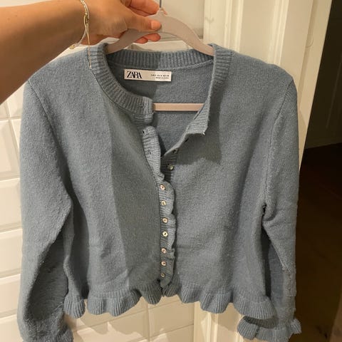 Pent og lite brukt skinnjakke fra Zara i imitert skinn. God og varm. Hempen som man henger opp jakken med er røket, men lapp med størrelse er like bak så har bare brukt p henge opp jakken etter den. Ellers ingen skader på jakken.