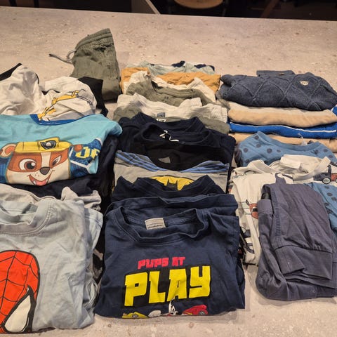 Stor klespakke i 98/104, brukt av tvillinggutter og dobbelt opp av alt. Noe nupper og en og annen flekk kan forekomme, men mye fine klær. Finner ikke hull.